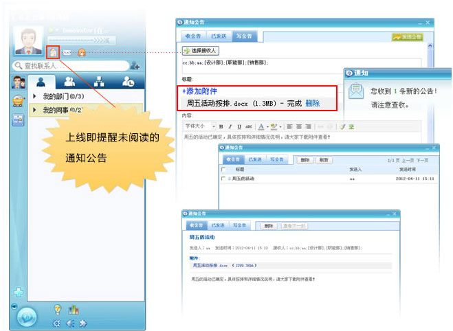 像邮件一样的通知公告(文字/图片/超链接/附件),实时推送及用户上线自动提醒。